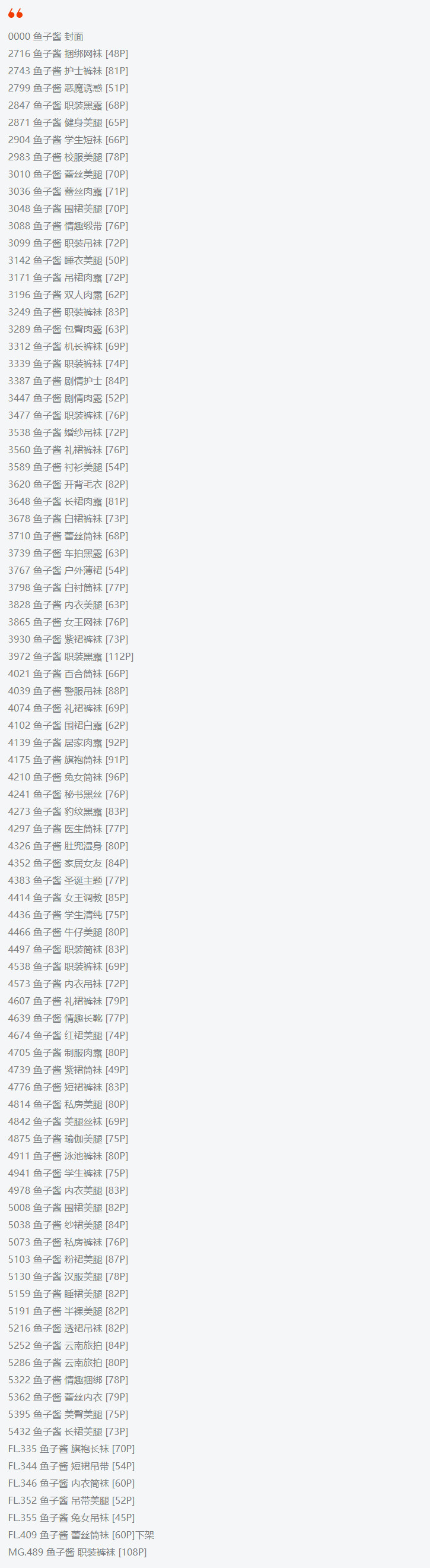 鱼子酱fish出的图集也是比较的多,本站也收集到了60套,到月底估计就会增加到了89套作品了,里面的每一部作品,都是非常值得我们去看看欣赏的。鱼子酱fish作品分别有:情3142、入学体检、视频原片运动、三亚运动、生日系列等……